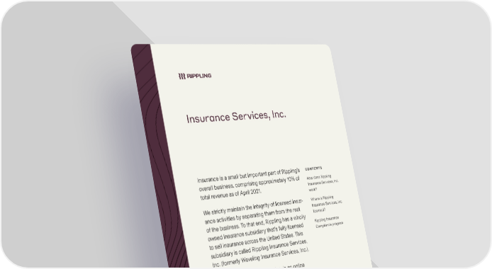 How does Rippling Insurance Services, Inc. work? Most of the time, customers bring their own third-party broker when they join Rippling, or we refer them to one. But for small businesses that prefer a fully digital solution, Rippling Insurance Services, Inc. can act as their broker of record (BOR). As broker of record, Rippling Insurance Services, Inc. earns commis- sions from the sale of insurance products and receives ongoing commissions. Each insurance company will set commission rates based on the standards and requirements of the industry in your area. Our business structure—a fully licensed insurance agency subsidiary of a parent company that has non-insurance operations—is considered a best practice in our industry. Among other things, it makes it easier to ensure the integrity of licensed activities, and to make sure that individuals transacting insurance are supervised by licensed personnel. Where is Rippling Insurance Services, Inc. licensed? Rippling Insurance Services, Inc. is fully licensed in all 50 states and the District of Columbia, and brokers insurance products in 34 of those states. We have experienced insurance agents in every state in which we offer insurance products. Their licensing information is available on our website and is updated daily. Our agents also have the required “appointments” from insurance carriers, authorizing them to sell insur- ance for those carriers and “affiliations” with state insurance regulatory agencies. All of the carrier appointments and state affiliations for Rippling Insurance Services, Inc. and our representatives are a matter of public record. rippling.com | Insurance Services, Inc. 2