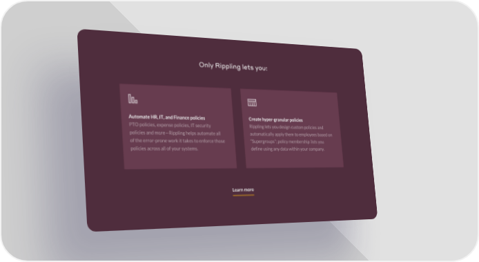 Only Rippling lets you: Automate HR, IT, and Finance policies Create hyper-granular policies PTO policies, expense policies, IT security Rippling lets you design custom policies and policies and more—Rippling helps automate all automatically apply them to employees based on ofthe error-prone work it takes to enforce those “Supergroups”; policy membership lists you policies across all of your systems. define using any data within your company. Learn more
