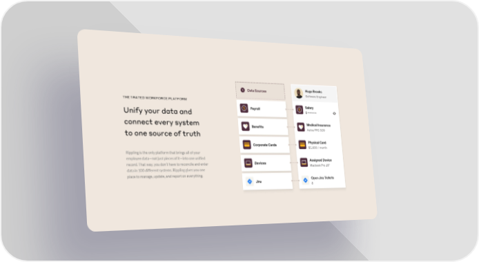 THE 1 RATED WORKFORCE PLATFORM Unify your data and connect every system to one source of truth Rippling is the only platform that brings all ofyour employee data—not just pieces of it—into one unified record. That way, you don’t have to reconcile and enter data in 100 different systems. Rippling gives you one place to manage, update, and report on everything.