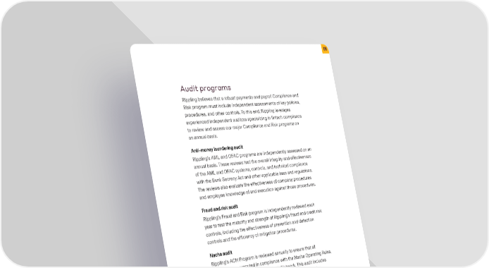 Audit programs Rippling believes that a robust payments and payroll Compliance and Risk program must include independent assessments of key policies, procedures, and other controls. To this end, Rippling leverages experienced independent auditors specializing in fintech compliance to review and assess our major Compliance and Risk programs on an annual basis. Anti-money laundering audit Rippling’s AML and OFAC programs are independently assessed on an annual basis. These reviews test the overall integrity and effectiveness of the AML and OFAC systems, controls, and technical compliance with the Bank Secrecy Act and other applicable laws and regulations. The reviews also evaluate the effectiveness of company procedures and employee knowledge of and execution against those procedures. Fraud and risk audit Rippling’s Fraud and Risk program is independently reviewed each year to test the maturity and strength of Rippling’s fraud and credit risk controls, including the effectiveness of prevention and detection controls and the efficiency of mitigation procedures. Nacha audit Rippling’s ACH Program is reviewed annually to ensure that all processes are executed in compliance with the Nacha Operating Rules, the governing organization of the ACH Network. This audit includes a review of our compliance policies and framework, information security policies, and other operational procedures relevant to the creation, transmission, and return of ACH files with partner institutions. Rippling helps businesses manage all their employee operations— Rippling helps businesses manage all their employee operations— from HR to IT—in a single place, enabling you to automate payroll, from HR to IT—in a single place, enabling you to automate payroll, benefits, computers, apps, and more. benefits, computers, apps, and more. ©© 2 2002211 R Ripippplinlingg 4