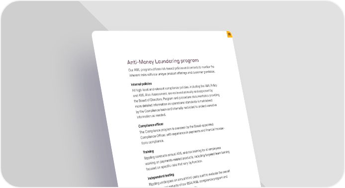 Anti-Money Laundering program Our AML program utilizes risk-based policies and controls to monitor the inherent risks with our unique product offerings and customer portfolios. Internal policies All high-level and relevant compliance policies, including the AML Policy and AML Risk Assessment, are reviewed annually and approved by the Board of Directors. Program and procedure documentation providing more detailed information on operational standards is maintained by the Compliance team and internally restricted to protect sensitive information as needed. Compliance officer The Compliance program is overseen by the Board-appointed Compliance Officer, with experience in payments and financial transac- tions compliance. Training Rippling conducts annual AML and risk training for all employees working on payments-related products, including targeted team training focused on specific risks that vary by function. Independent testing Rippling undergoes an annual third-party audit to evaluate the overall adequacy and maturity of our BSA/AML compliance program and adherence to regulatory requirements. Customer due diligence Rippling maintains a robust Know Your Customer (KYC) program (also known as a Customer Due Diligence program), which includes enhanced due diligence procedures designed to understand customer risk profiles and provide a greater level of scrutiny where appropriate. Risk and fraud operations Robust fraud detection and risk mitigation measures are essential to ensuring a safe and healthy payments and payroll platform and overall financial ecosystem. To this end, Rippling has developed and runs a rippling.com | Payments Compliance and Risk Programs 2